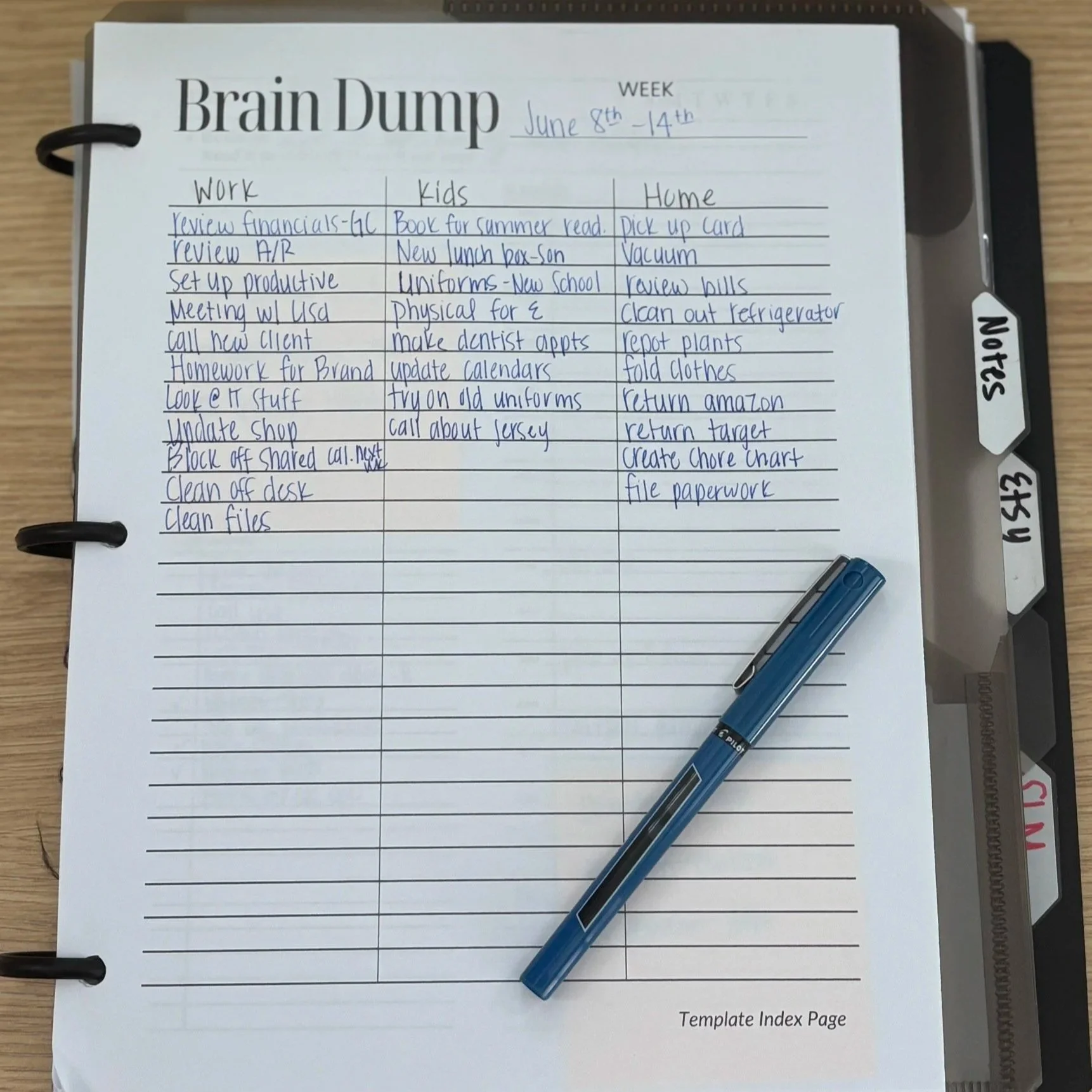 I write down everything that is floating in my head. This isn’t a checklist of what I have to do this week, this is everything that is floating around in my head. Some I’ll get to this week… Some I probably won’t get to until next year. AND THAT IS OKAY. I break it up into 3 sections. Work - Kids - Home/Me. (sometimes sections will change.. but you do you boo and chose whatever you want).